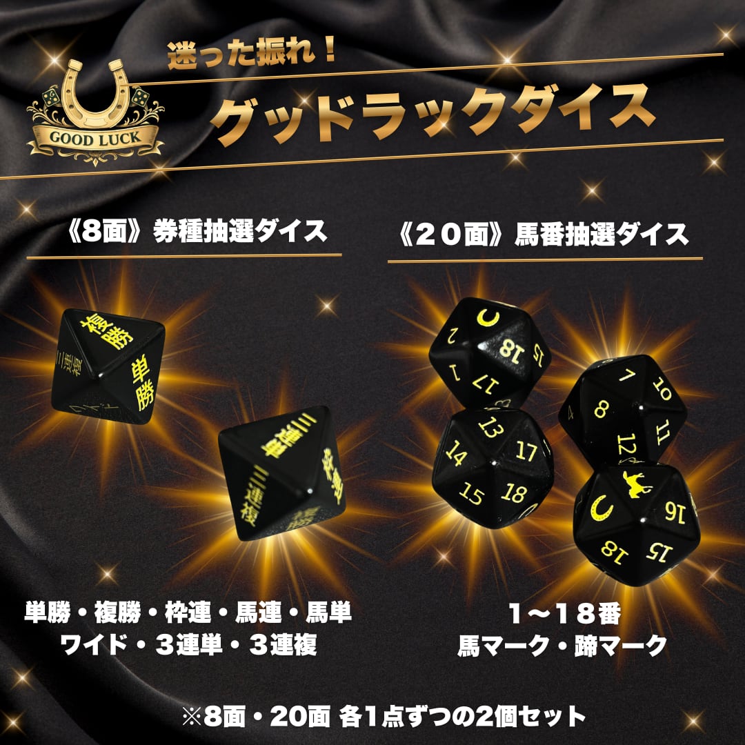 競馬をもっと楽しむためのグッドラックダイス!このサイコロがあれば、あなたの競馬ライフは更に充実し、楽しい瞬間に満ちあふれること間違いありません!運を味方にして、毎回のレースをもっとエキサイティングにしましょう!